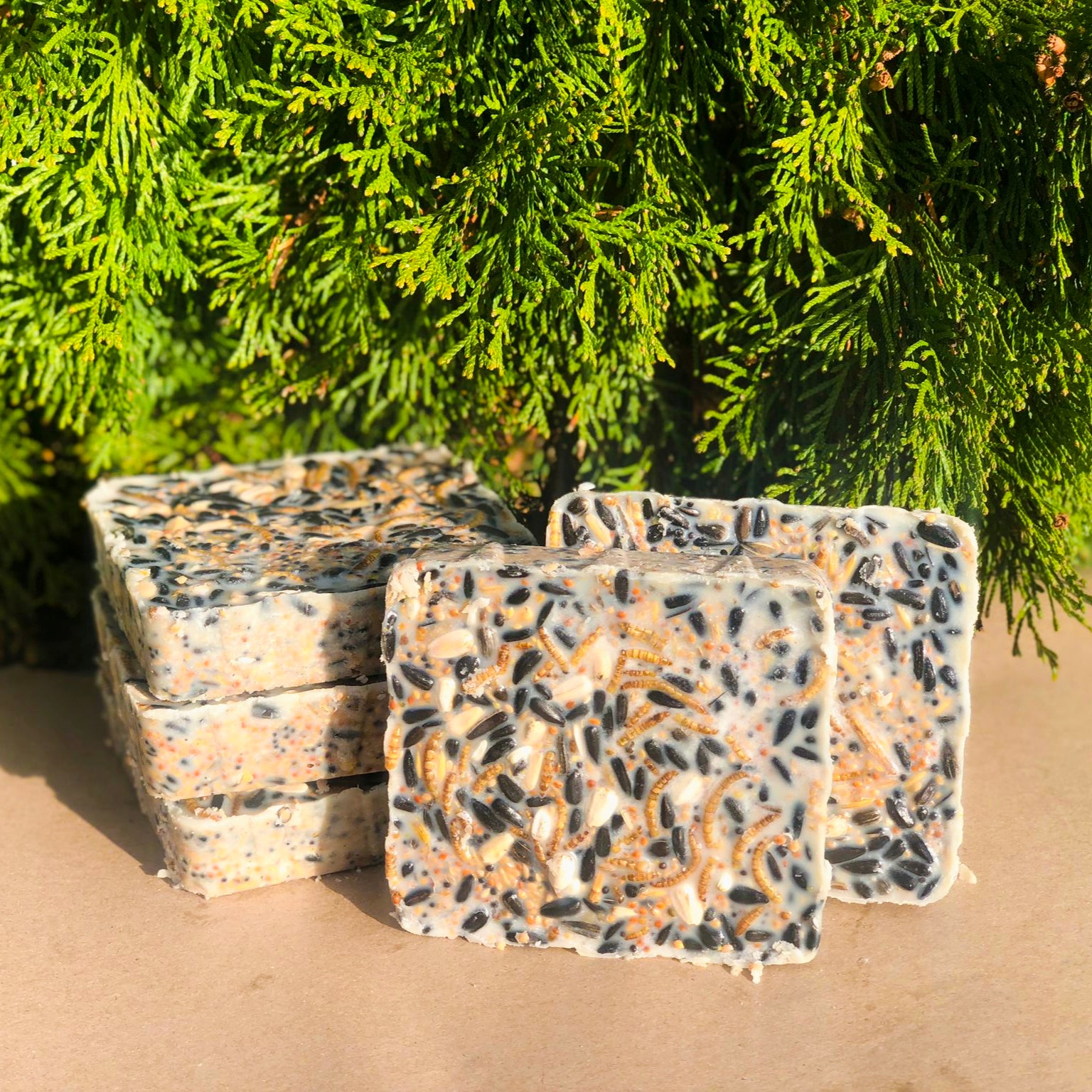 Lojový koláč 🌿, hmotnost 300g , nabízí tradiční směs semen 🌾, obilovin a olejnin 🌻. Vylepšený pořádnou dávkou výživných moučných červů 🐛.